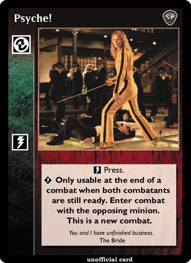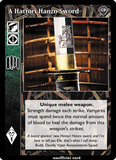 Bill - Budd | Elle - Kenji | O-Ren - Vernita | Johnny - Quentin | Bastard Sword - Day Operation | Desert Eagle - Freak Drive | A Hattori Hanzo Sword - Pursuit | Rolling with the Punches - Temptation